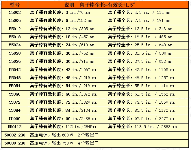 根據離子棒長度選型,型號的后兩位為離子棒的有效長度,單位為英寸(1英寸=25.4mm)。