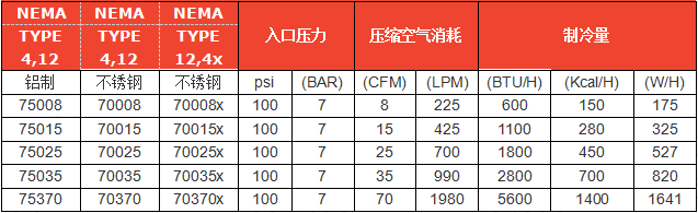 美國AiRTX機(jī)箱冷卻器防護(hù)等級有三種:NEMA 4(防濺水), 4X(防腐蝕)和 NEMA 12(防塵防油)。它的型號及技術(shù)參數(shù)如下: