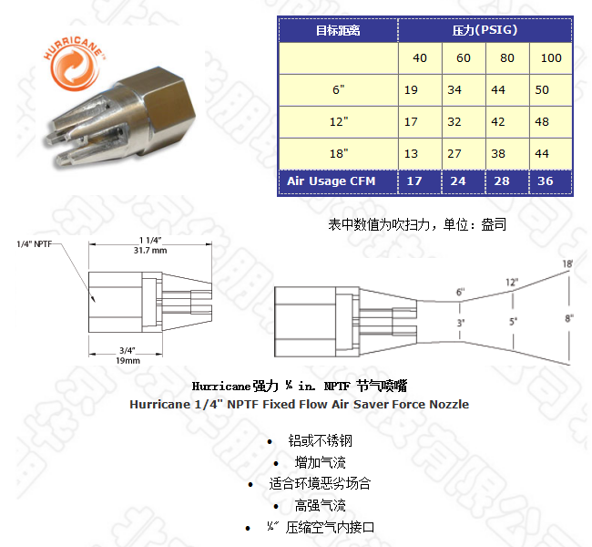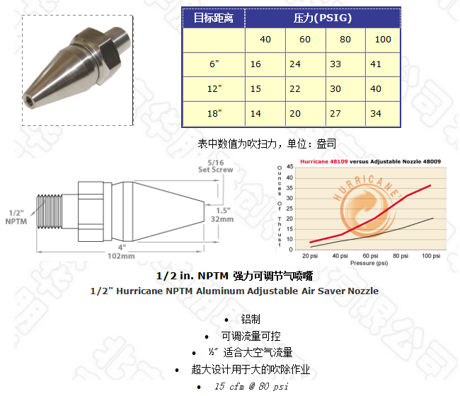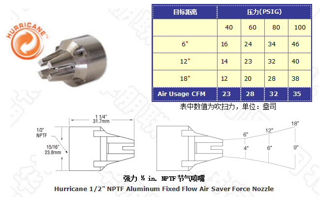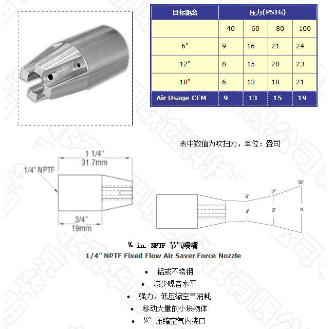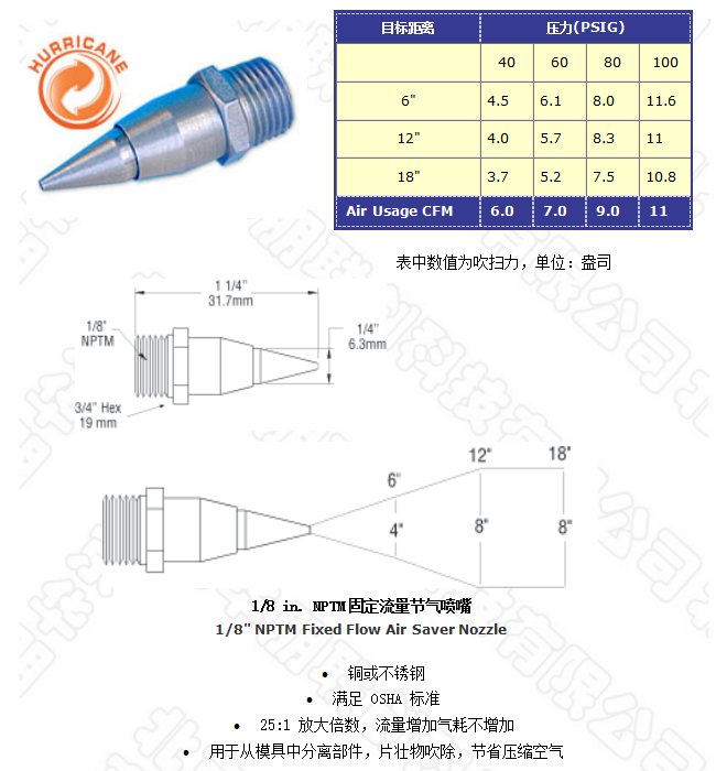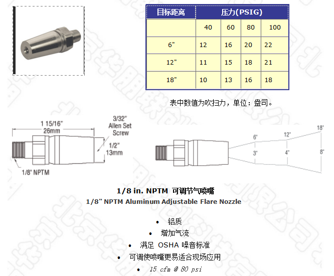 48008型噴嘴有 25:1的空氣放大倍數,它可產生的強大吹力廣泛應用于工廠清潔槍,同時它符合OSHA要求的噪聲極限和安全壓力要求。