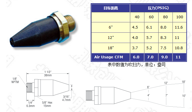 * 強力型噴嘴用于移動重物、在較短時間從工件上除去液體及大氣流快速干燥等。